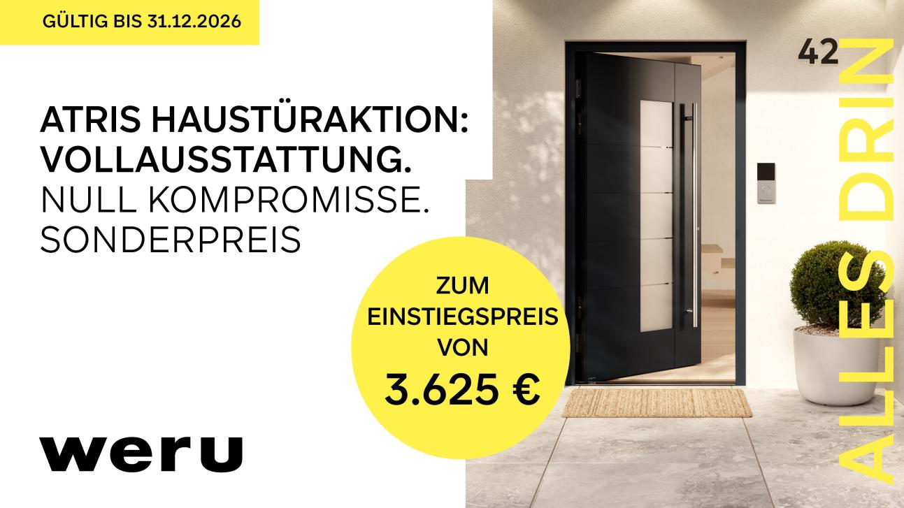 Jetzt Haustür zum Aktionspreis sichern Die WERU Aluminium-Haustür-Aktion ist nur für begrenzte Zeit gültig bis 31.03.2026.